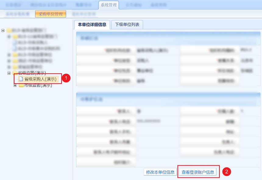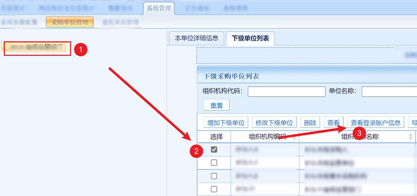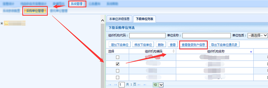 方法一,在左側(cè)組織樹找到下級單位并選中,然后點擊查看登錄賬戶信息。