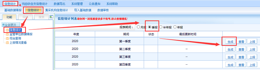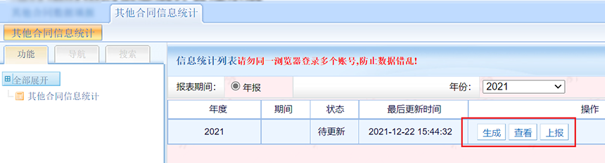 第三步,點擊其他合同信息統(tǒng)計生成報表(其他合同只有年報,沒有季報),生成完成,檢查數(shù)據(jù)無誤后,點擊上報按鈕上報數(shù)據(jù)。