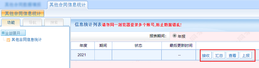 第四步,下級單位上報數(shù)據(jù)后,監(jiān)管單位在其他合同信息統(tǒng)計頁面接受匯總報表。
