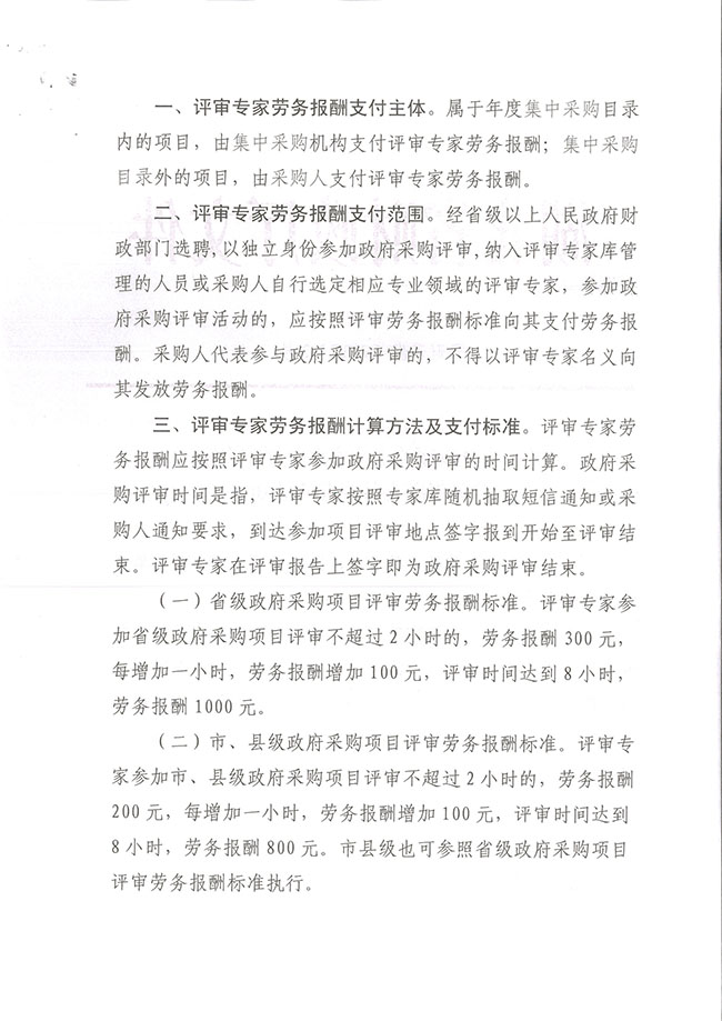 (二)市、縣級政府采購項目評審勞務報酬標準。評審專家參加市、縣級政府采購項目評審不超過2小時的,勞務報酬200元,每增加一小時,勞務報酬增加100元,評審時間達到8小時,勞務報酬800元。市縣級也可參照省級政府采購項目評審勞務報酬標準執(zhí)行。